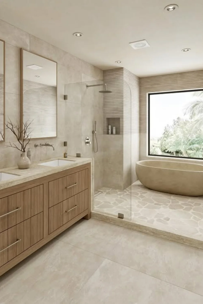 Warm neutrals dominate spa bathrooms in 2026. These tones sit between beige, soft gray, and muted clay. They reflect light gently and work well with skin tones. Warm neutrals also allow natural materials to shine without overpowering the space.