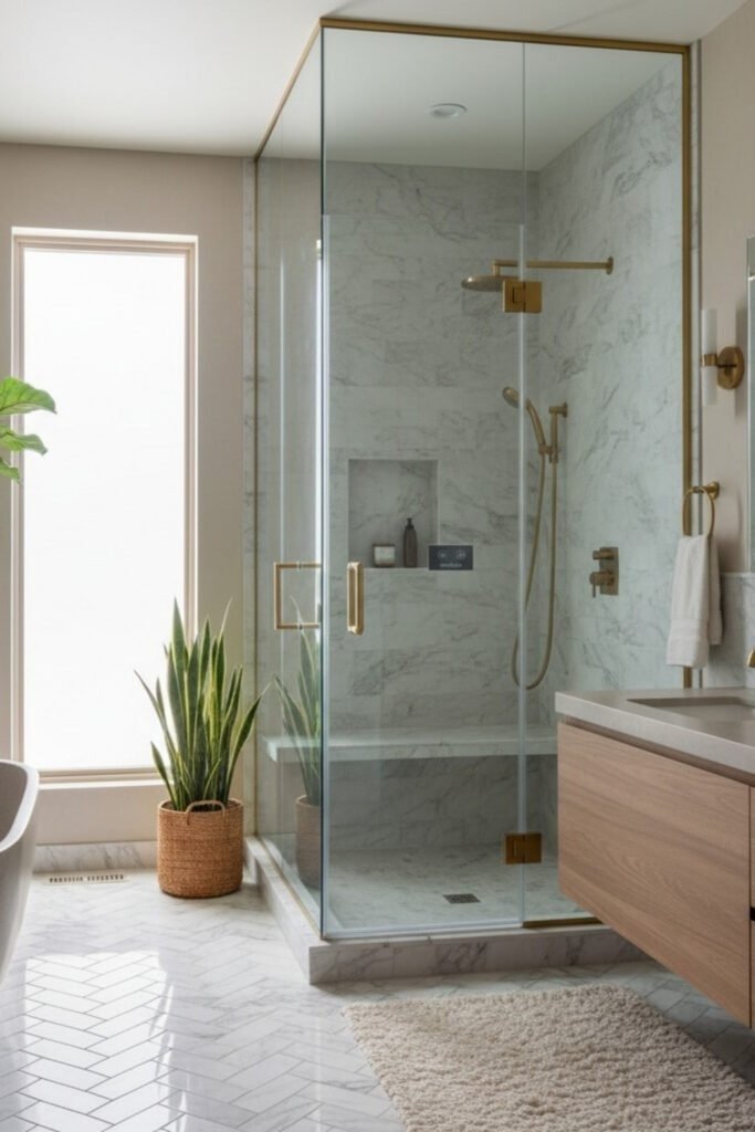 A marble shower sanctuary focuses on enclosure and warmth. The shower becomes a private space where sound softens and light reflects gently. Careful lighting and simple hardware allow the marble to feel calm instead of overwhelming.