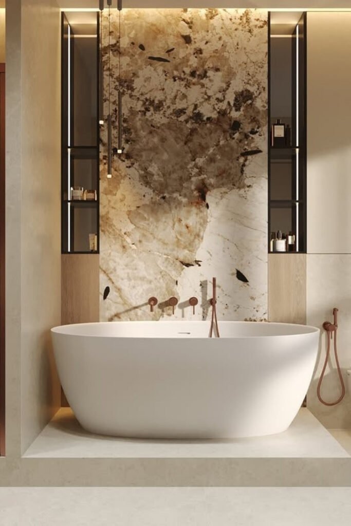 A single stone backdrop can define the entire bathroom. This might be behind the tub, vanity, or shower. The stone becomes the visual anchor, allowing everything else to stay simple. Choosing one strong surface instead of many keeps the room balanced and easy to live with.