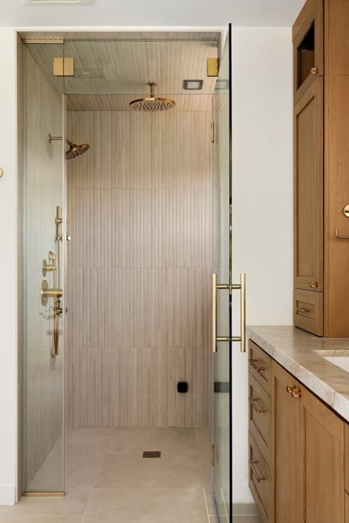 A seamless shower removes visual breaks that interrupt calm. This usually means a walk-in shower with a simple glass panel and no raised curb. Water drains quietly into a linear or hidden drain, allowing the floor to feel continuous. When the shower blends into the rest of the room, the space feels larger and calmer. Over time, homeowners appreciate how easy this design is to clean and how natural it feels to step into without barriers.