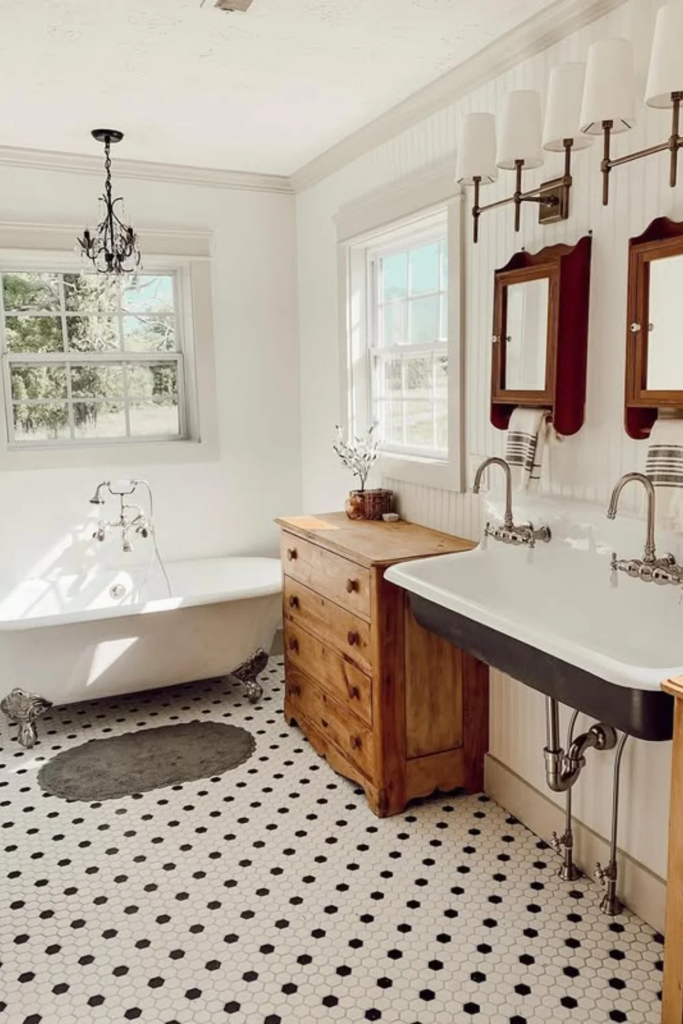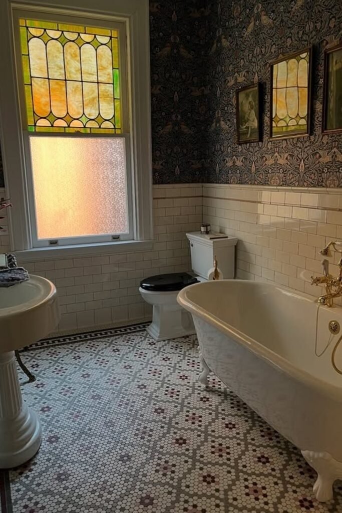 A freestanding tub has always been the heart of a true vintage bathroom. In 2026, this idea works best when the tub is given space to breathe. Placing it near a window or centered on a wall creates a calm and grounded feeling. White or soft cream tubs still lead, but gentle off-white tones are becoming more common because they hide wear better over time.