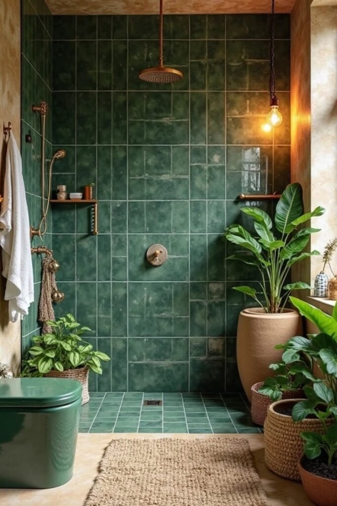 This idea works because tile lasts and ages well. The room feels solid and dependable. Green also connects the bathroom to nature, which helps the space feel restful.