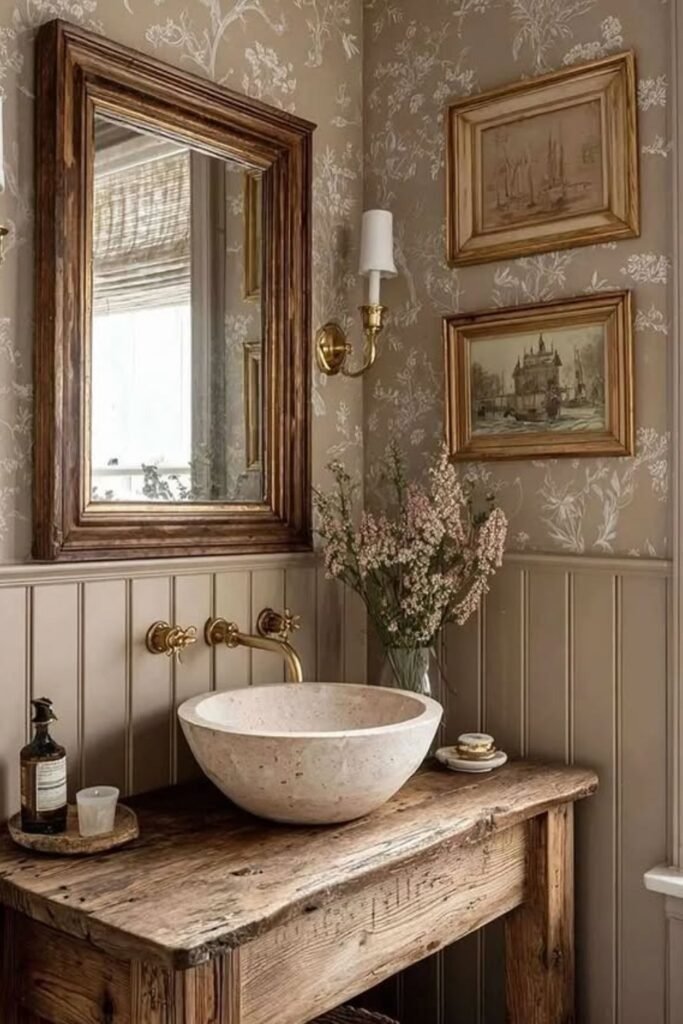 Powder rooms are perfect for darker vintage ideas. Deep colors on the walls create intimacy and mood. This style feels bold but controlled.