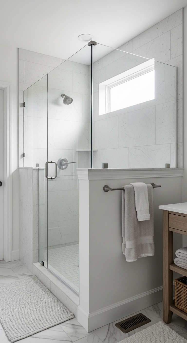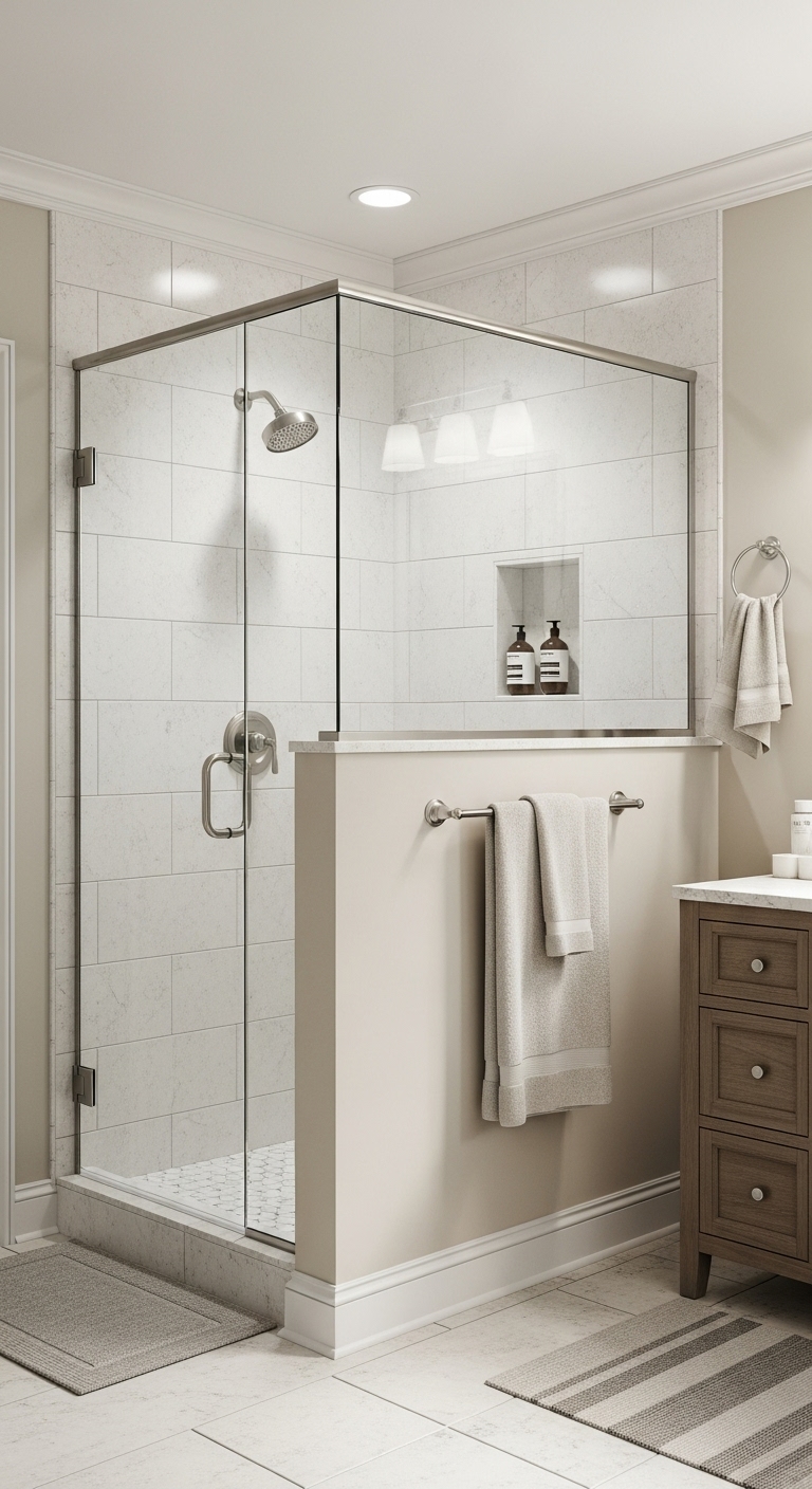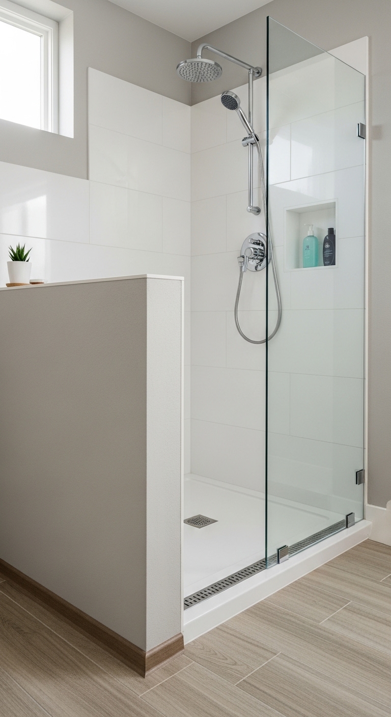 A timeless bathroom avoids trends that age quickly. A doorless walk in shower with a half wall fits many styles without locking you into one look. It works in modern, simple, and classic homes alike.