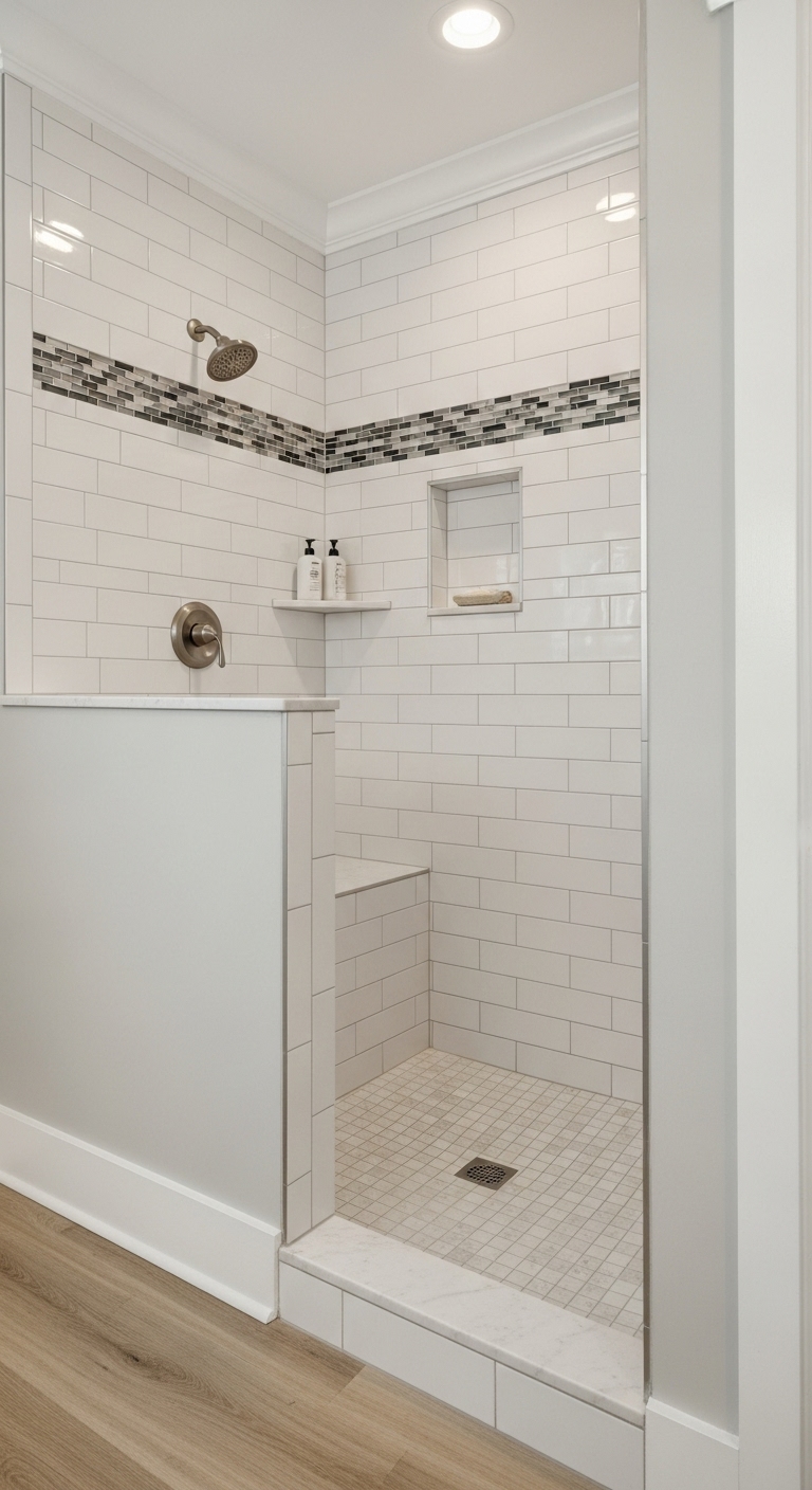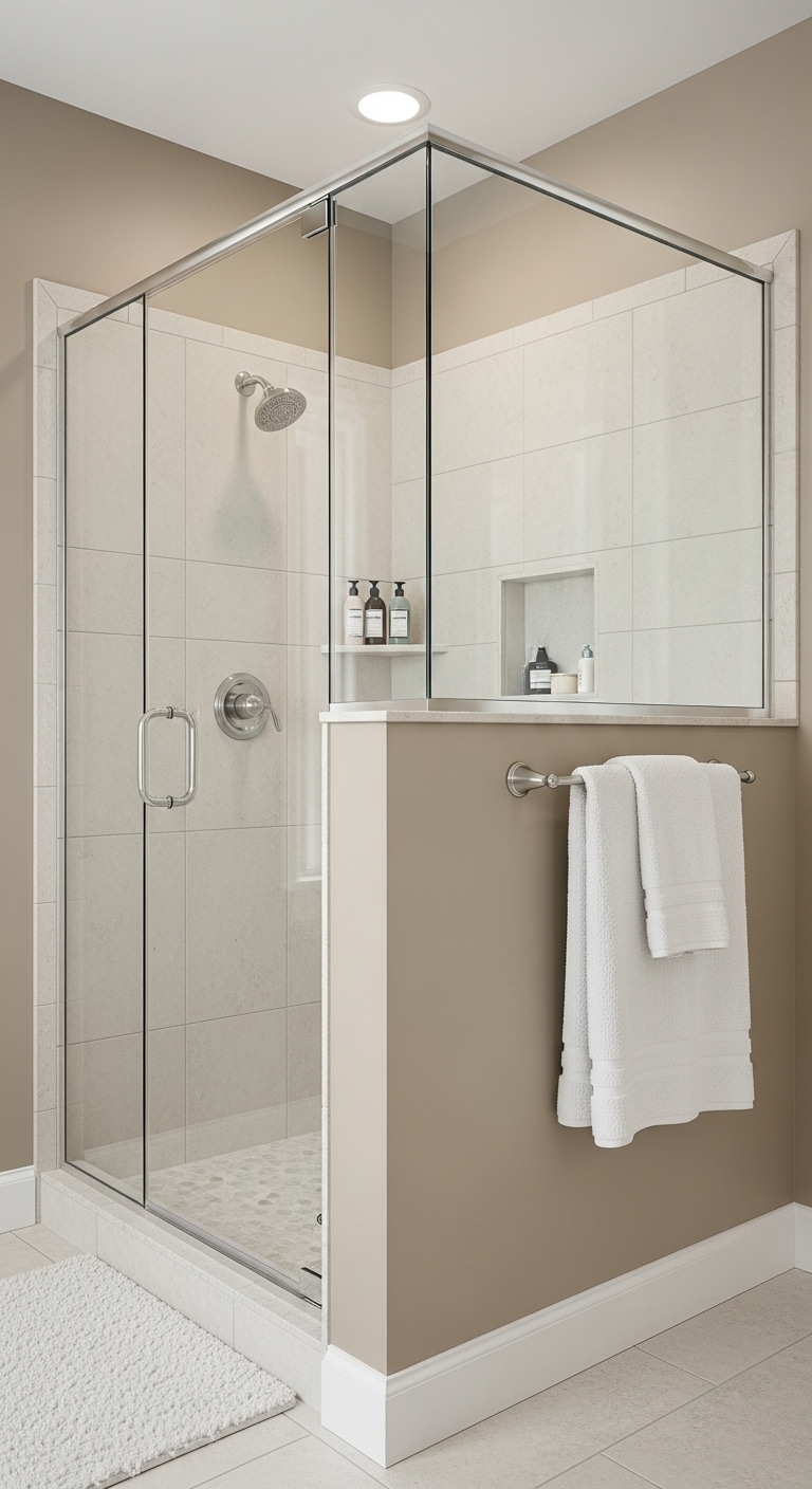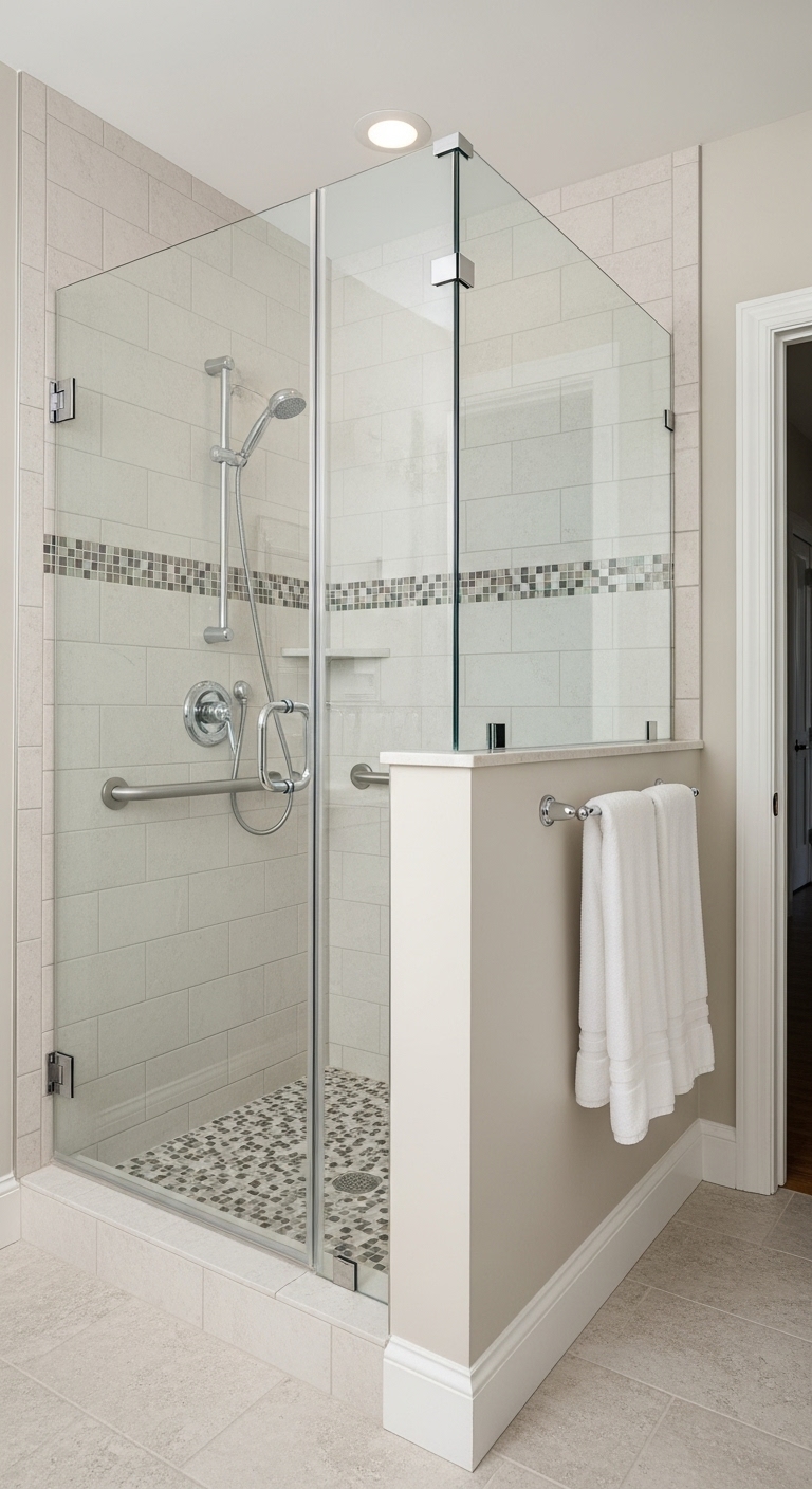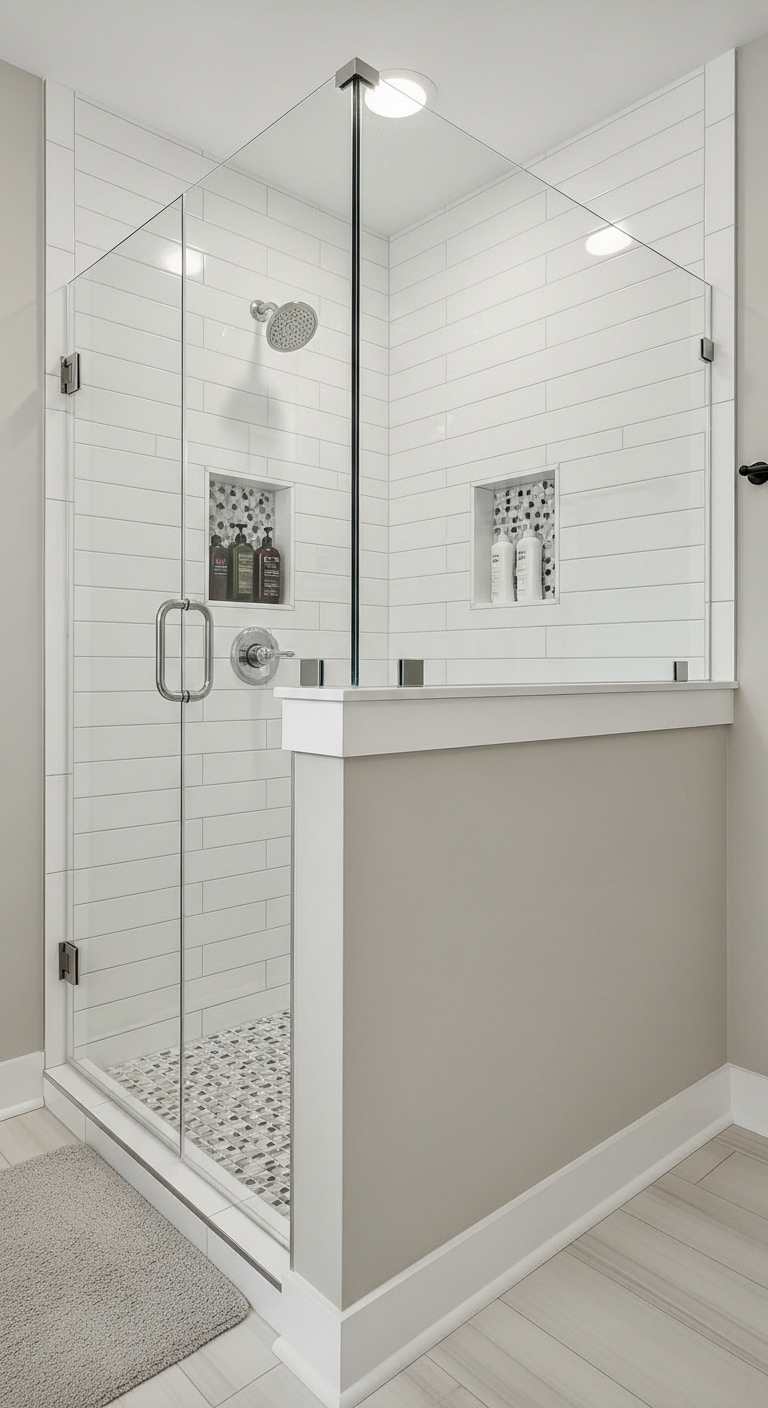 A timeless bathroom avoids trends that age quickly. A doorless walk in shower with a half wall fits many styles without locking you into one look. It works in modern, simple, and classic homes alike.