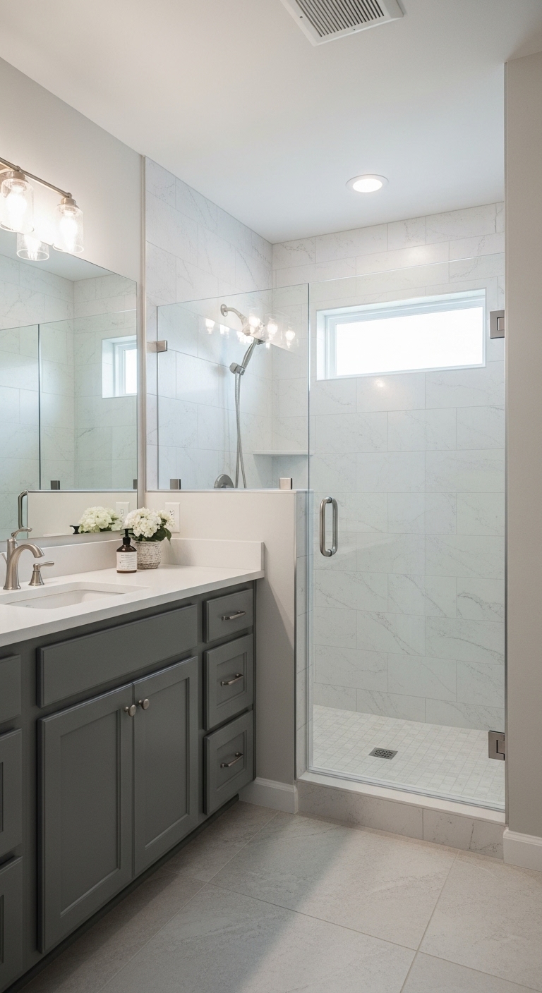 An open entry path creates a smooth flow from vanity to shower. This idea uses a half wall placed on one side, leaving the entry wide and clear. The layout feels modern but remains very practical for daily use.