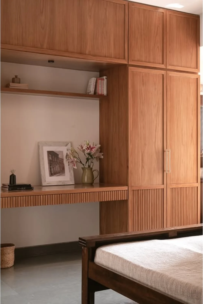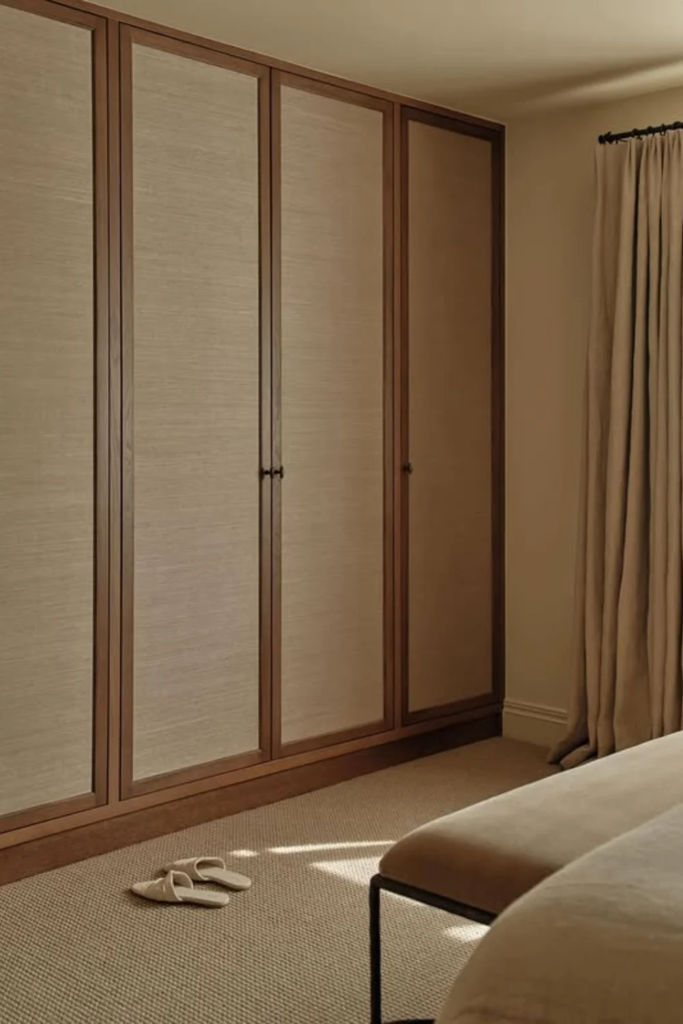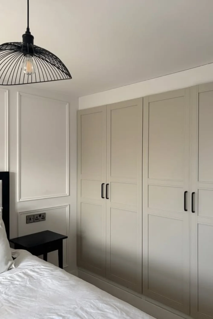 Panelled wardrobes provide a tactile and visual appeal to the bedroom. Bold panels in wood or painted finishes add depth and texture, creating interest on an otherwise plain wall. This design works well in rooms with minimal furniture, allowing the wardrobe to become a focal point.