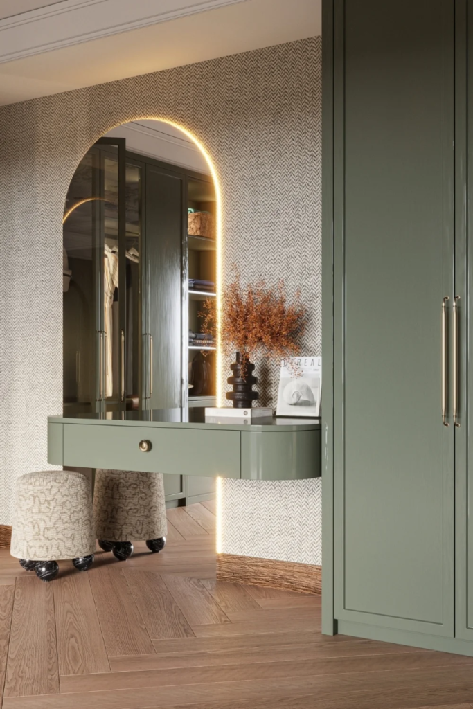 Arched dressing retreats combine curved designs with a compact dressing space. This layout can include pull-out drawers, small benches, and hanging rails, making it a practical and stylish corner. Arched retreats provide an elegant touch while keeping the bedroom organized.