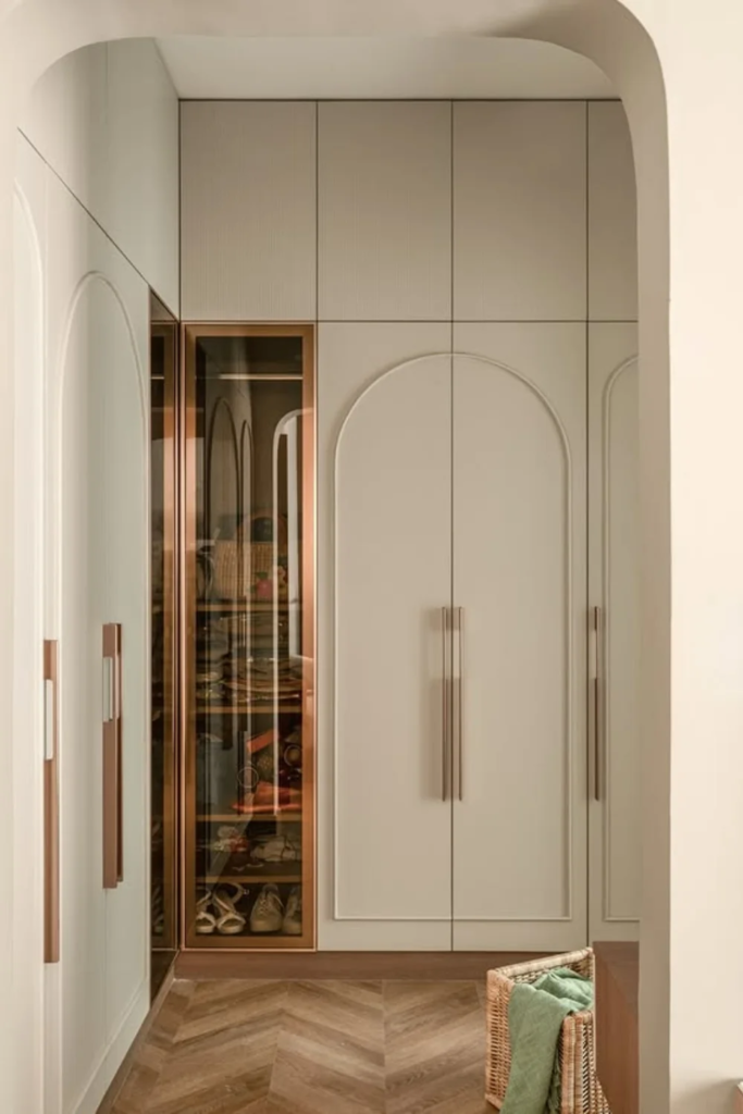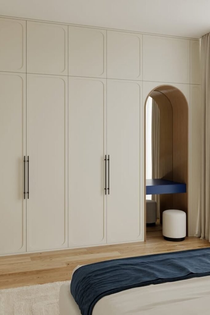 Arched wardrobes add a subtle architectural element to the bedroom. The arch softens the lines of the room and creates a sophisticated look without overwhelming the space. These wardrobes can include built-in storage and decorative details to enhance both style and function.