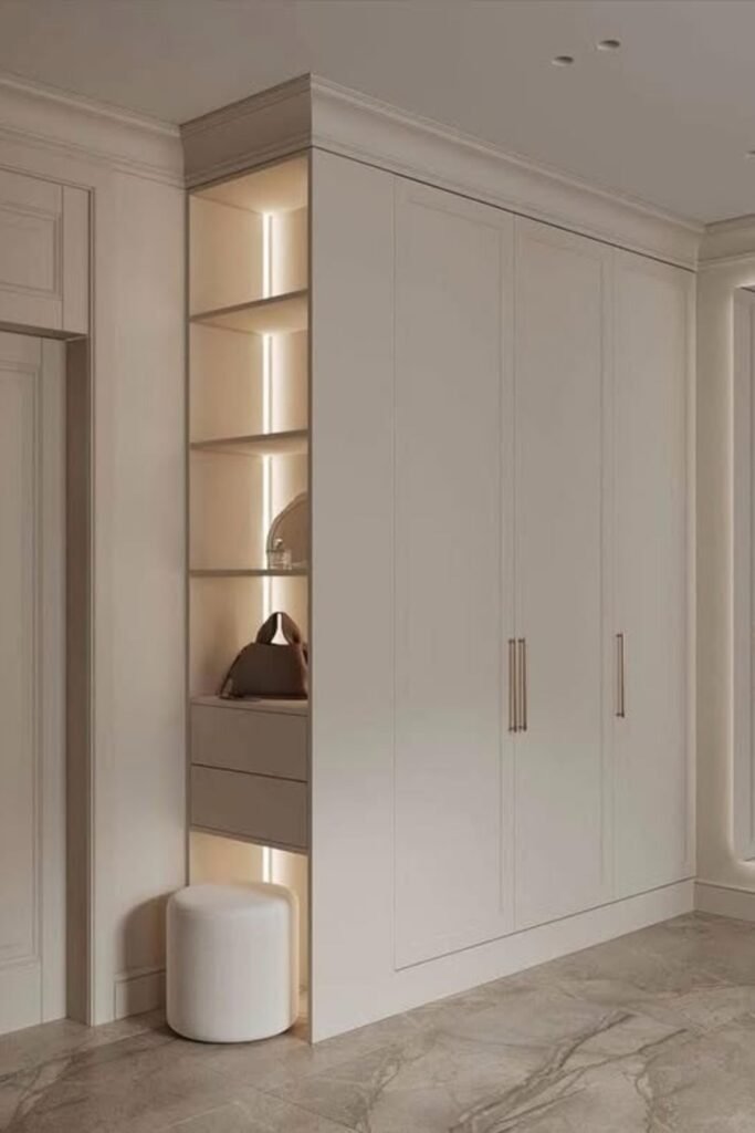 Adding lighting inside or around your wardrobe highlights its contents and adds a touch of sophistication. LED strips, spotlights, or backlighting can make clothes, shoes, and accessories more visible. A lit display wardrobe not only looks elegant but also makes it easier to select outfits, especially in dimly lit bedrooms.