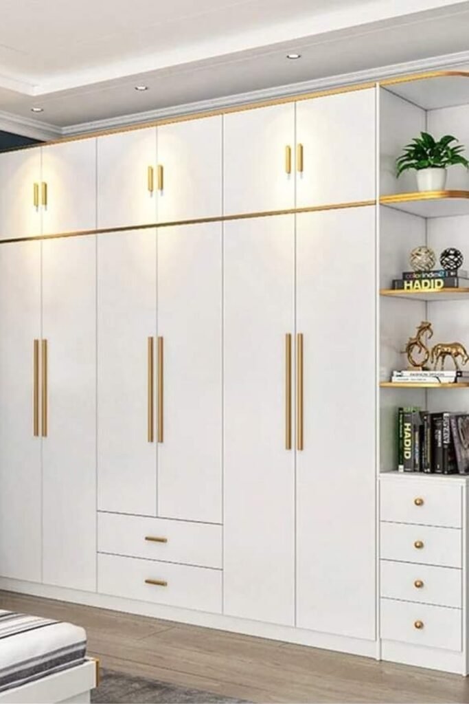 A luxury storage wall combines large wardrobes with additional storage units such as drawers, open shelves, and decorative cabinets. This type of design works best in spacious bedrooms, providing a centralized area for all your belongings. Luxury storage walls can incorporate rich wood finishes, high-quality handles, and built-in lighting for a refined look.