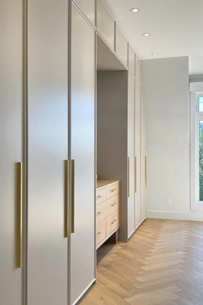 A built-in vanity within the wardrobe maximizes functionality. Drawers, shelves, and mirrors can be included in the same unit, keeping grooming items organized and easily accessible. Built-in vanity storage saves space and creates a clean, cohesive look in the bedroom.
