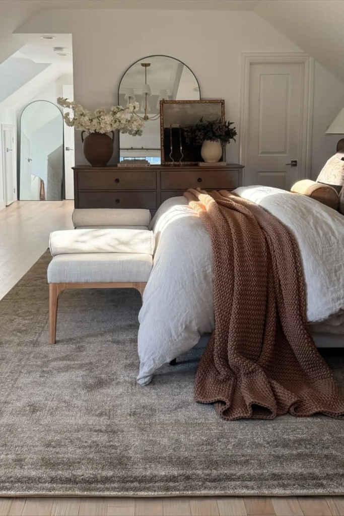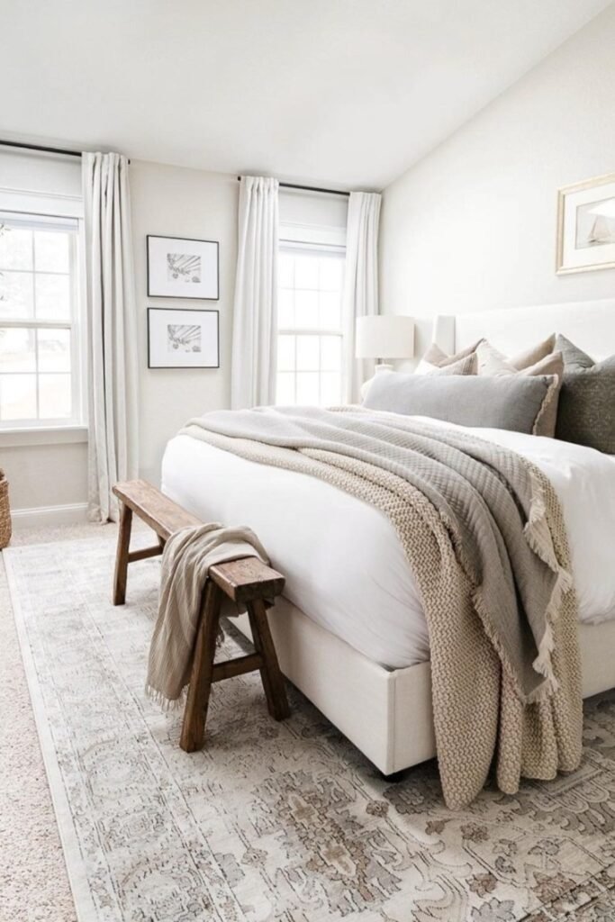 A bedroom feels warmer when neutrals are layered instead of matched. Using one flat shade on every surface makes a room feel unfinished. Soft layered neutrals work because each surface has a slightly different tone. Walls may lean warm white, bedding may lean cream, and rugs may bring in light tan. The eye reads this as depth, not clutter. This approach also makes small bedrooms feel calmer because nothing stands out too hard.
