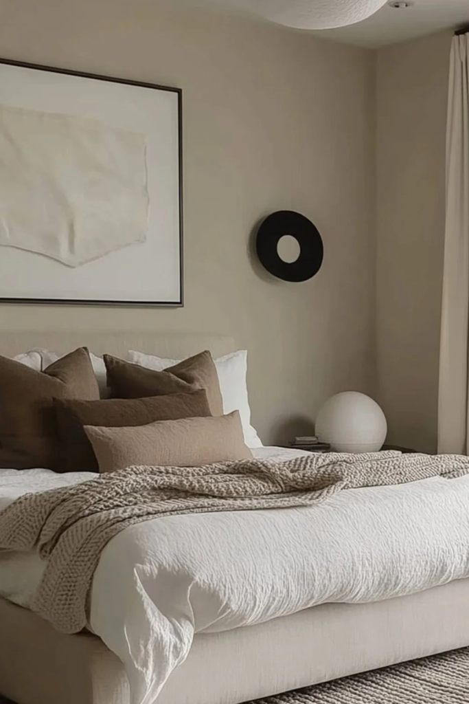 Contrast does not mean dark or dramatic. In a warm neutral bedroom, contrast can come from mixing soft beige with deeper tan or muted brown. This keeps the space from looking washed out. A darker throw at the foot of the bed or deeper pillows against light bedding gives the room shape. The contrast should feel soft, not sharp.