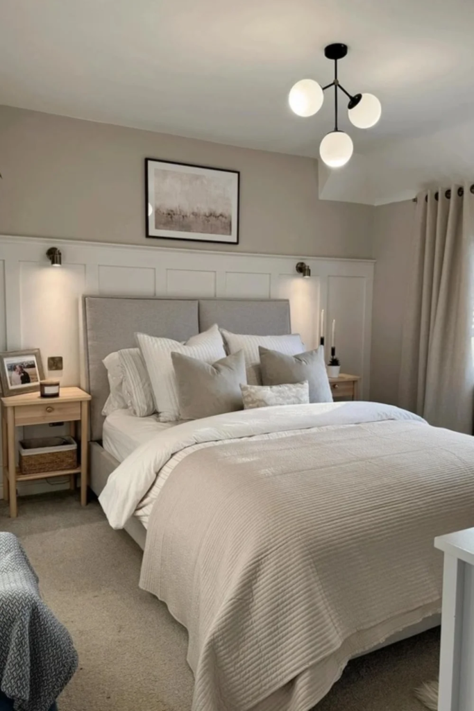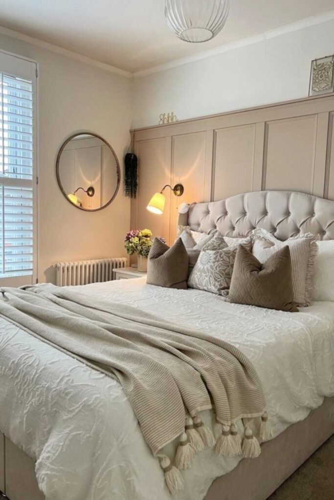 Panelled walls or headboards add texture and structure. When done in warm neutral tones, they make the bedroom feel cozy and finished. Panels do not need to be bold or dark. Soft beige or warm white panels add depth without visual weight.