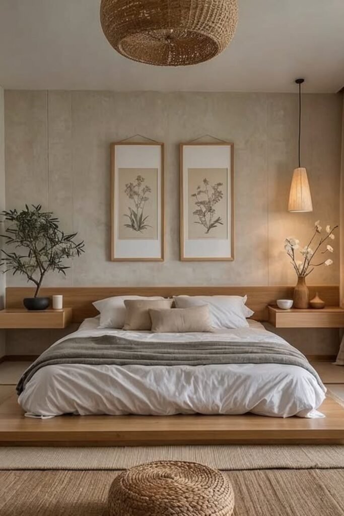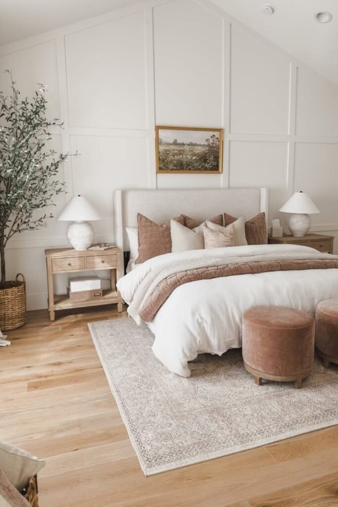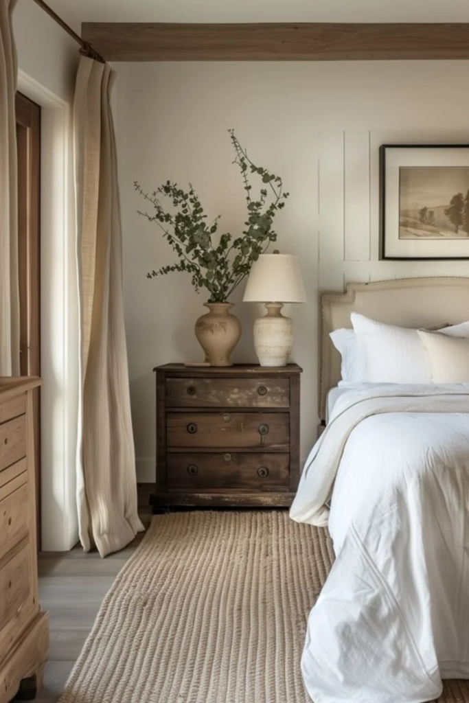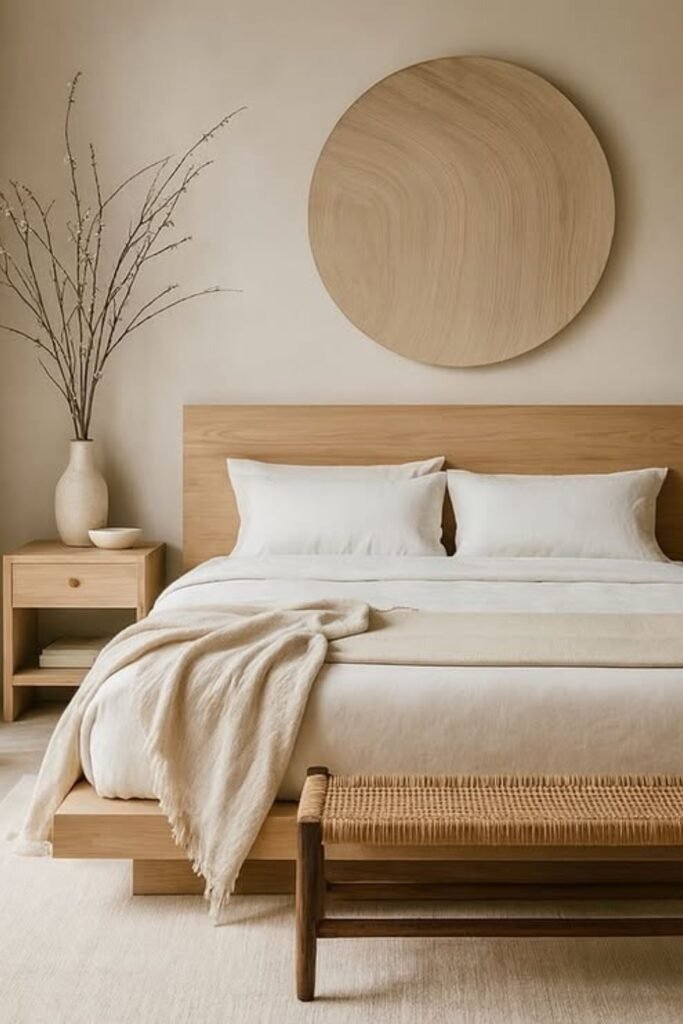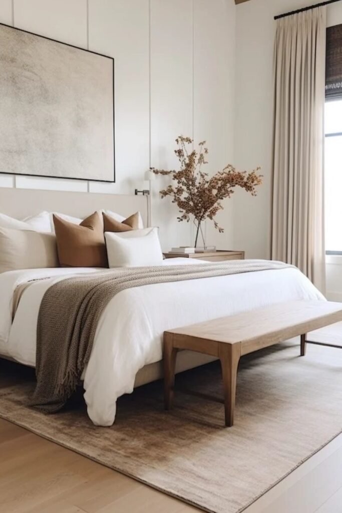 Rustic does not mean rough. In a warm neutral bedroom, rustic elements are softened. Light wood, woven fabrics, and gentle colors create a calm, relaxed space. This style feels welcoming and personal rather than styled.