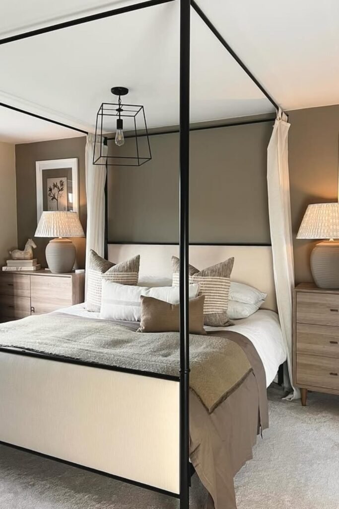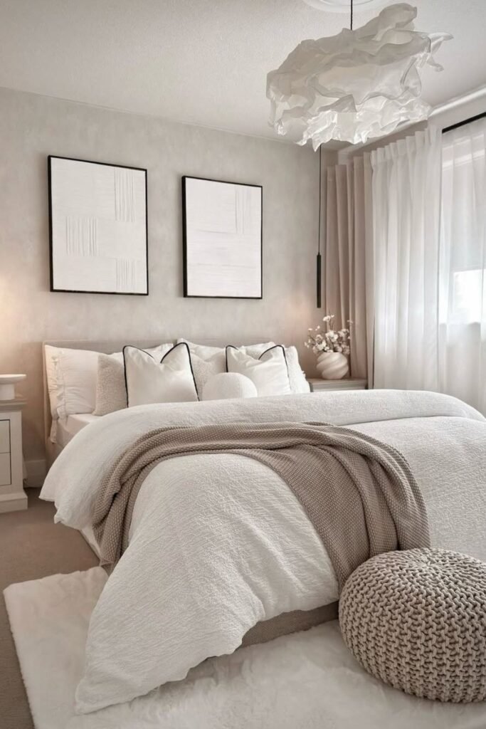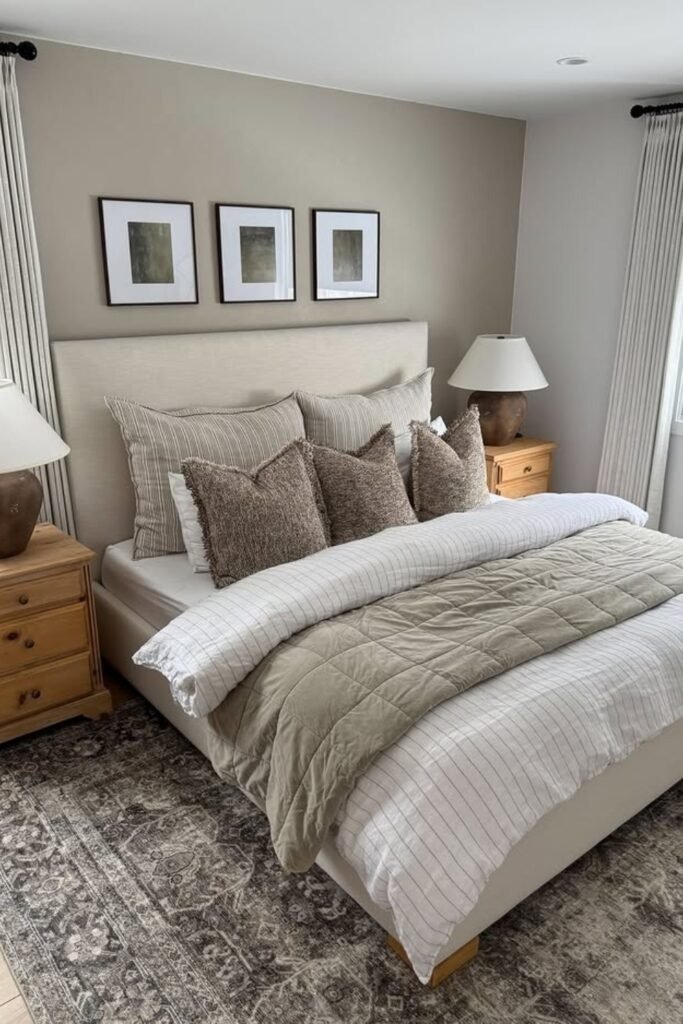 Adding framed art or wall panels in neutral tones gives the bedroom structure. This is not about bold artwork. It is about creating gentle contrast using frames, fabric panels, or textured wall art. The frame color should stay within the neutral family so the room feels pulled together. This method adds interest without breaking the calm mood.