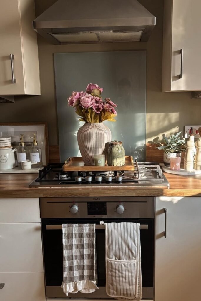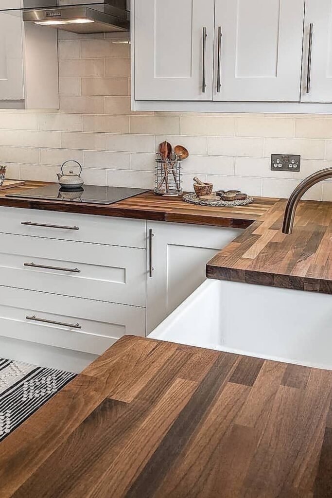 Wood counters add natural warmth. Over time they gain character instead of wear, making the kitchen feel lived in rather than used up.