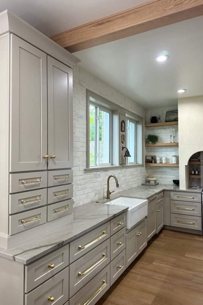 Soft gray-beige cabinets paired with aged brass handles add gentle shine. The metal catches light without glare.