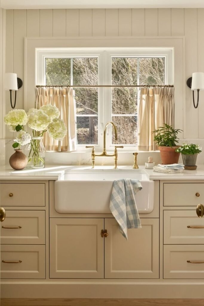 Cream reflects light better than pure white and works well in homes with limited windows. Brass adds depth without heaviness.