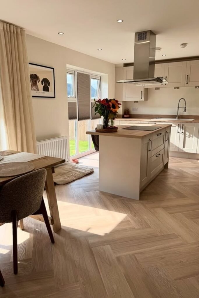 Light oak cabinets and floors blend gently, creating openness. Matching undertones prevent the room from feeling divided.