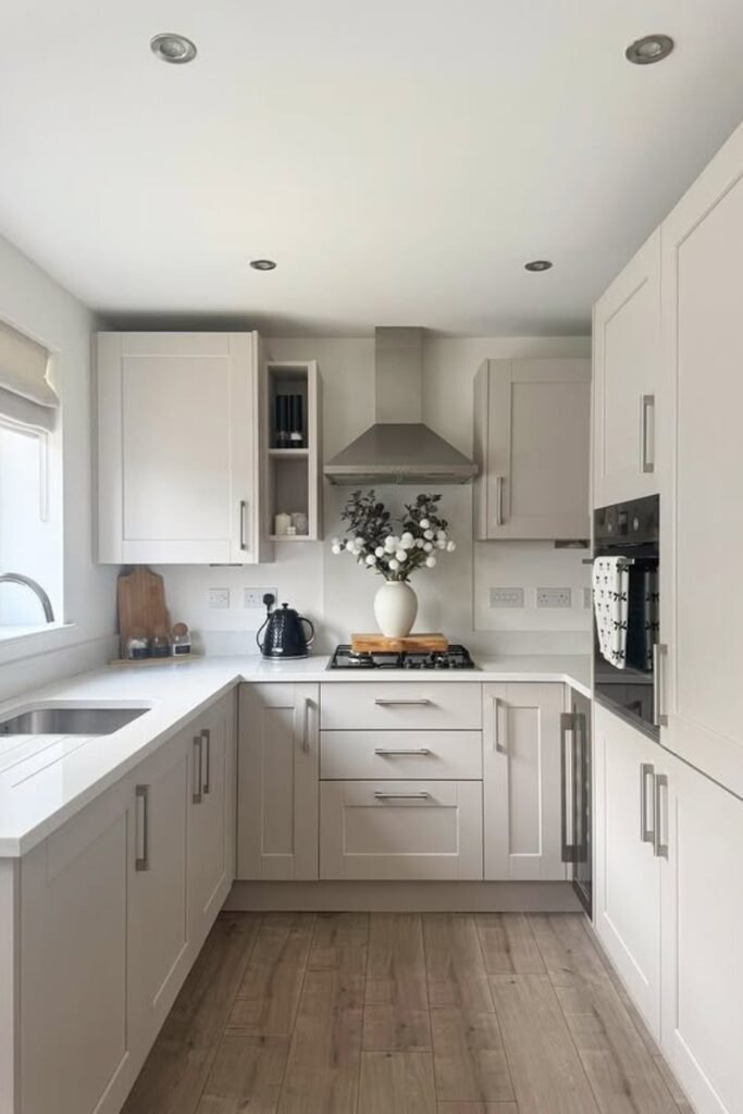 Warm white cabinetry works in almost any home. Pairing it with wood prevents clinical brightness.
