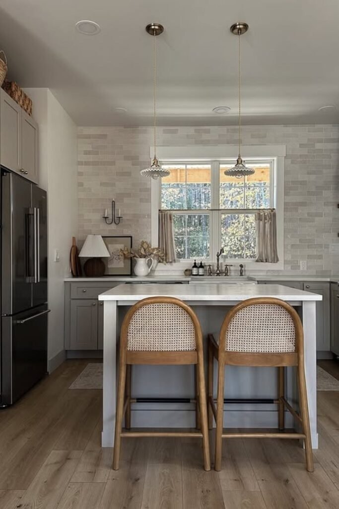 A greige island creates a center point without strong contrast. It anchors the room while keeping the overall space soft.