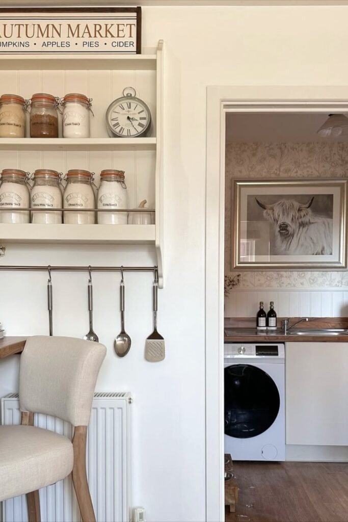 Light oak shelves add function and warmth together. Everyday items become part of the decor.