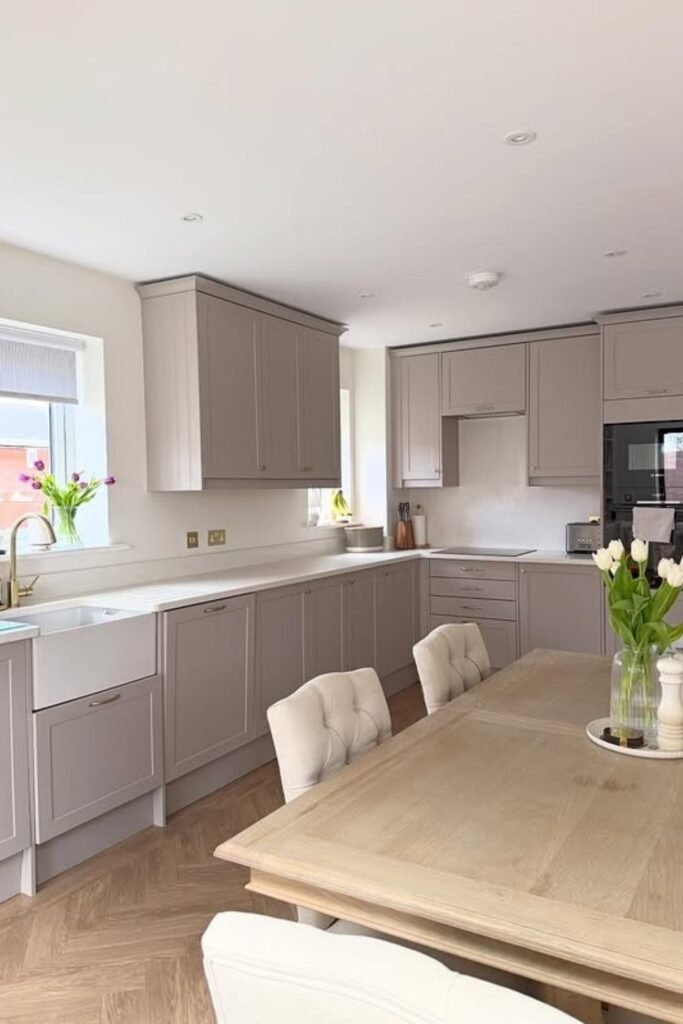 Taupe walls behind neutral cabinets add depth without darkness. The effect feels steady rather than dramatic.